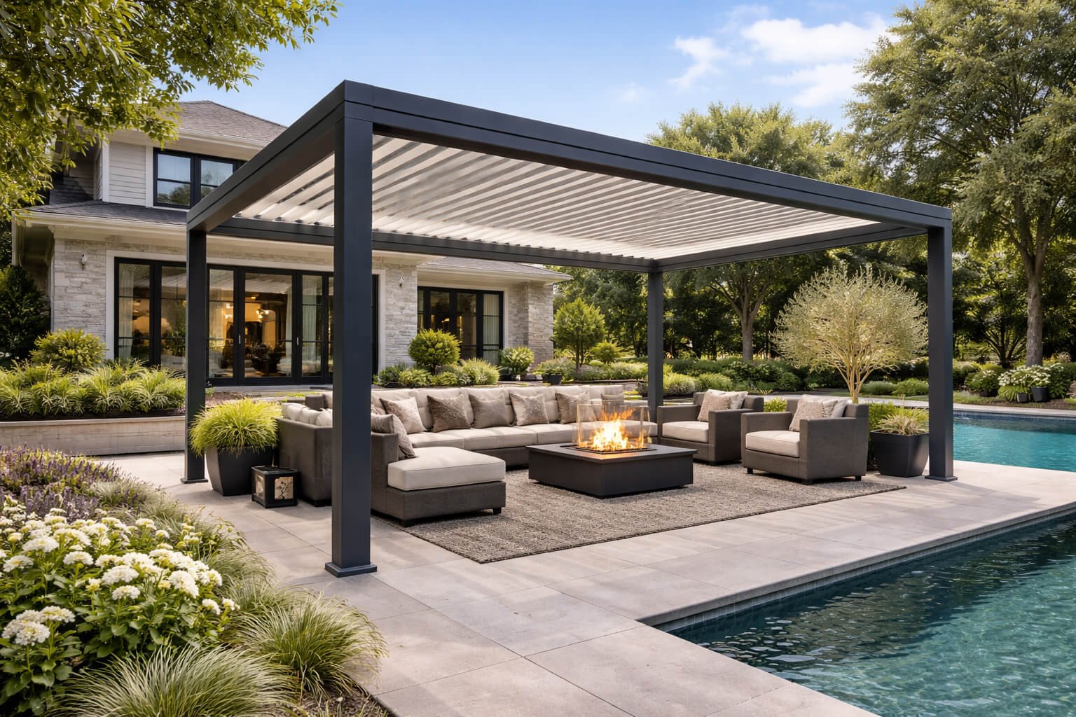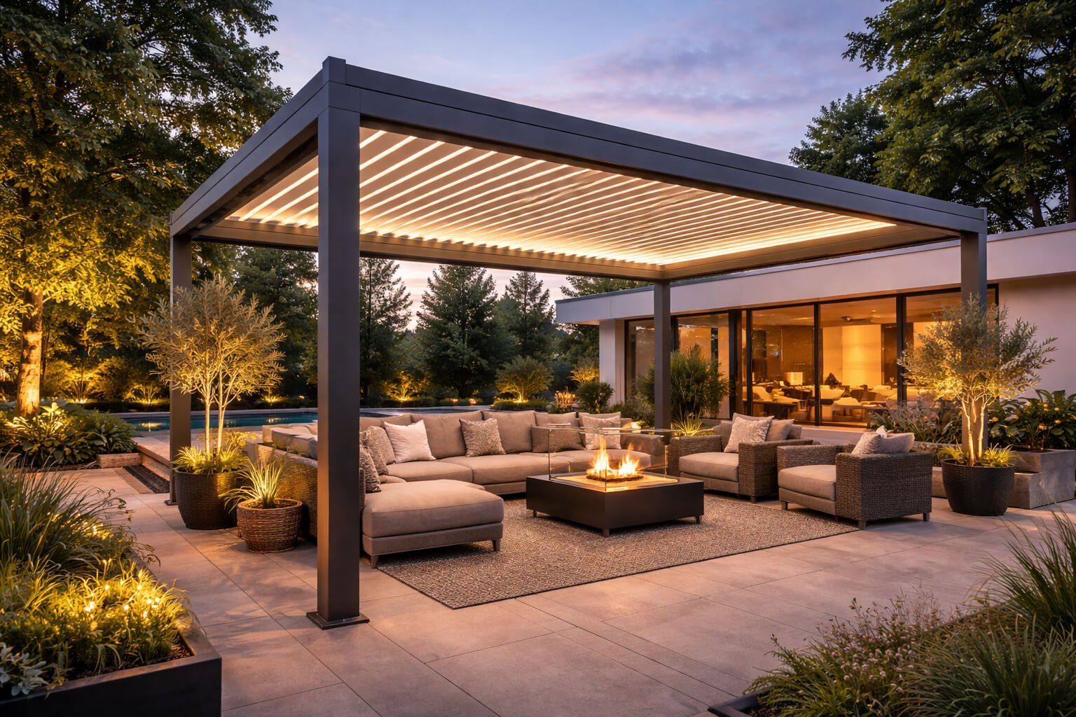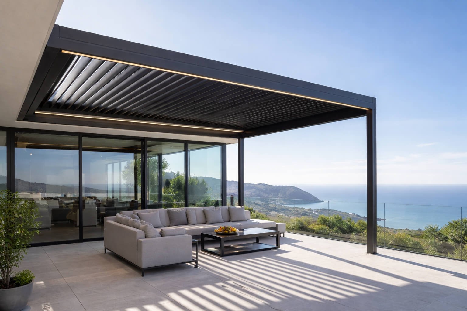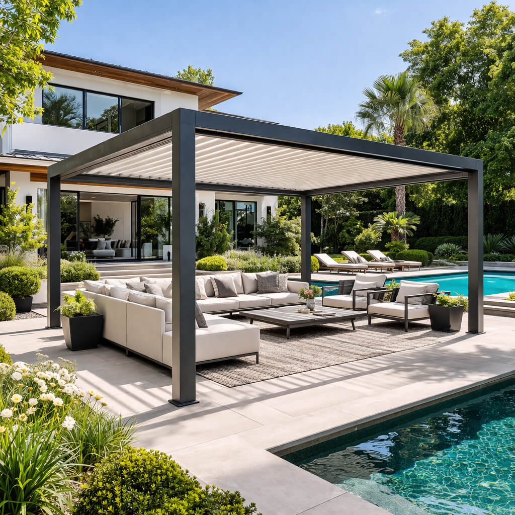 Bioklimatik pergola, tavanında bulunan alüminyum hareketli lameller sayesinde güneş ışığını, hava akışını ve gölgeyi kontrol etmenizi sağlayan modern bir dış mekan sistemidir.