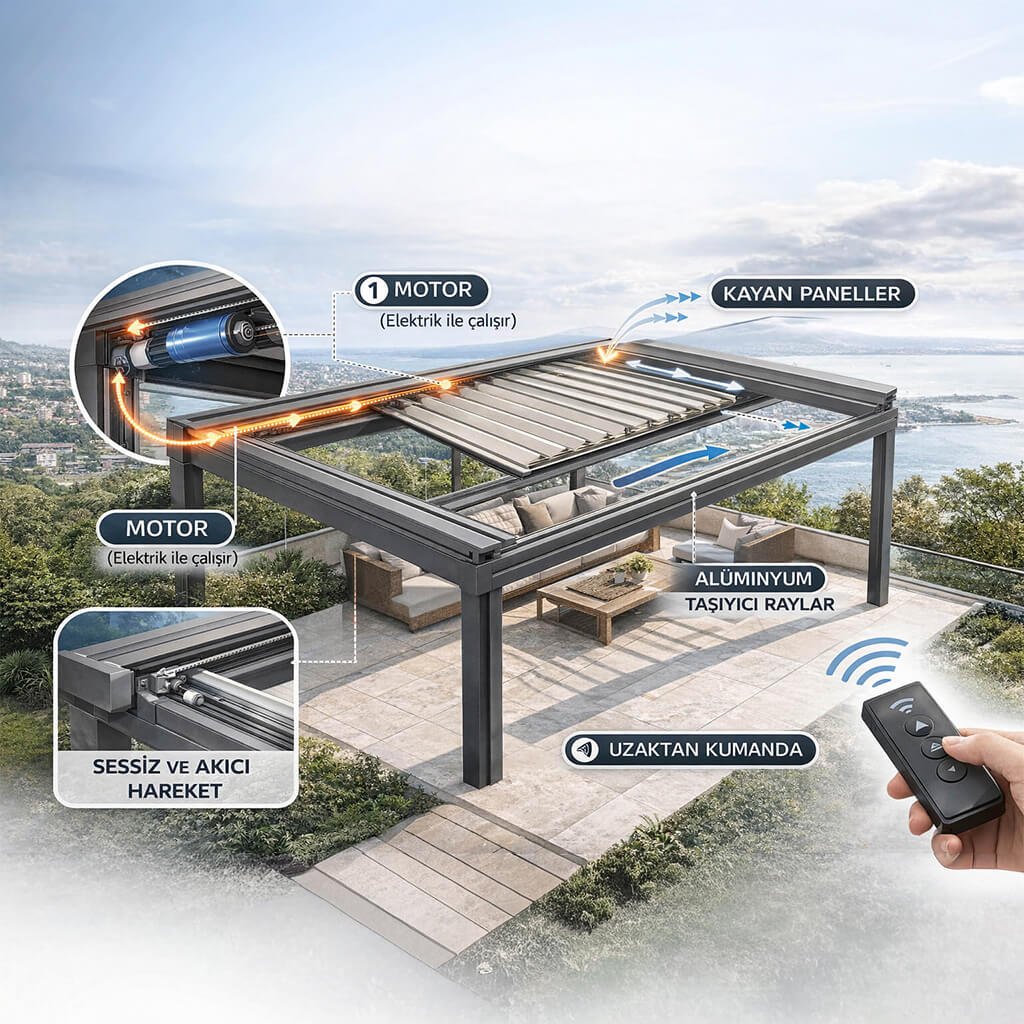Rolling Roof sistemleri, motorlu mekanizma sayesinde kontrollü ve akıcı bir şekilde hareket eder. Sistem içerisinde yer alan motor, taşıyıcı raylar ve hareketli tavan panelleri birbiriyle senkronize çalışarak çatının açılıp kapanmasını sağlar. Kullanıcı uzaktan kumanda, duvar butonu ya da otomasyon sistemi üzerinden komut verdiğinde paneller raylar boyunca kayarak istenilen pozisyona gelir.