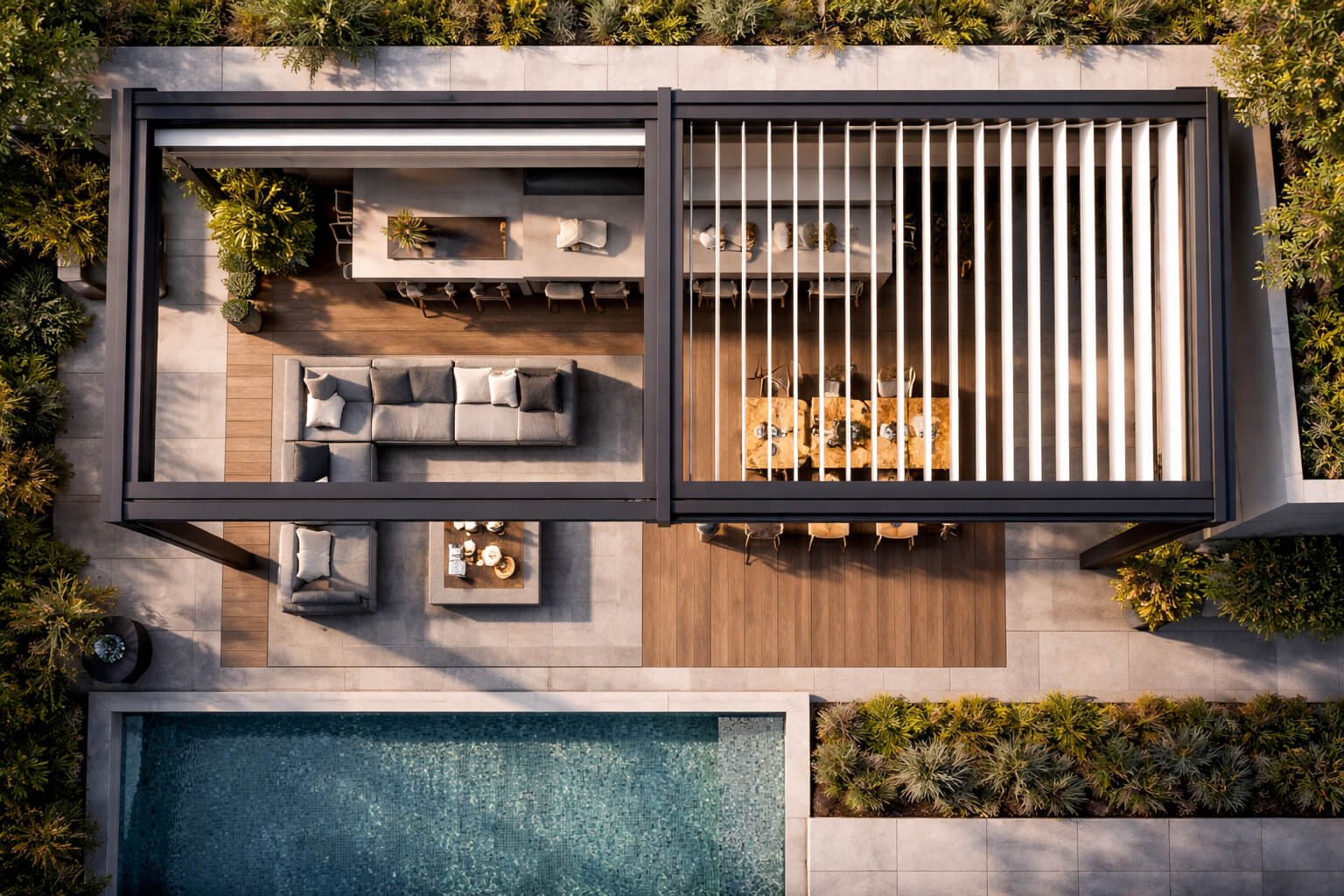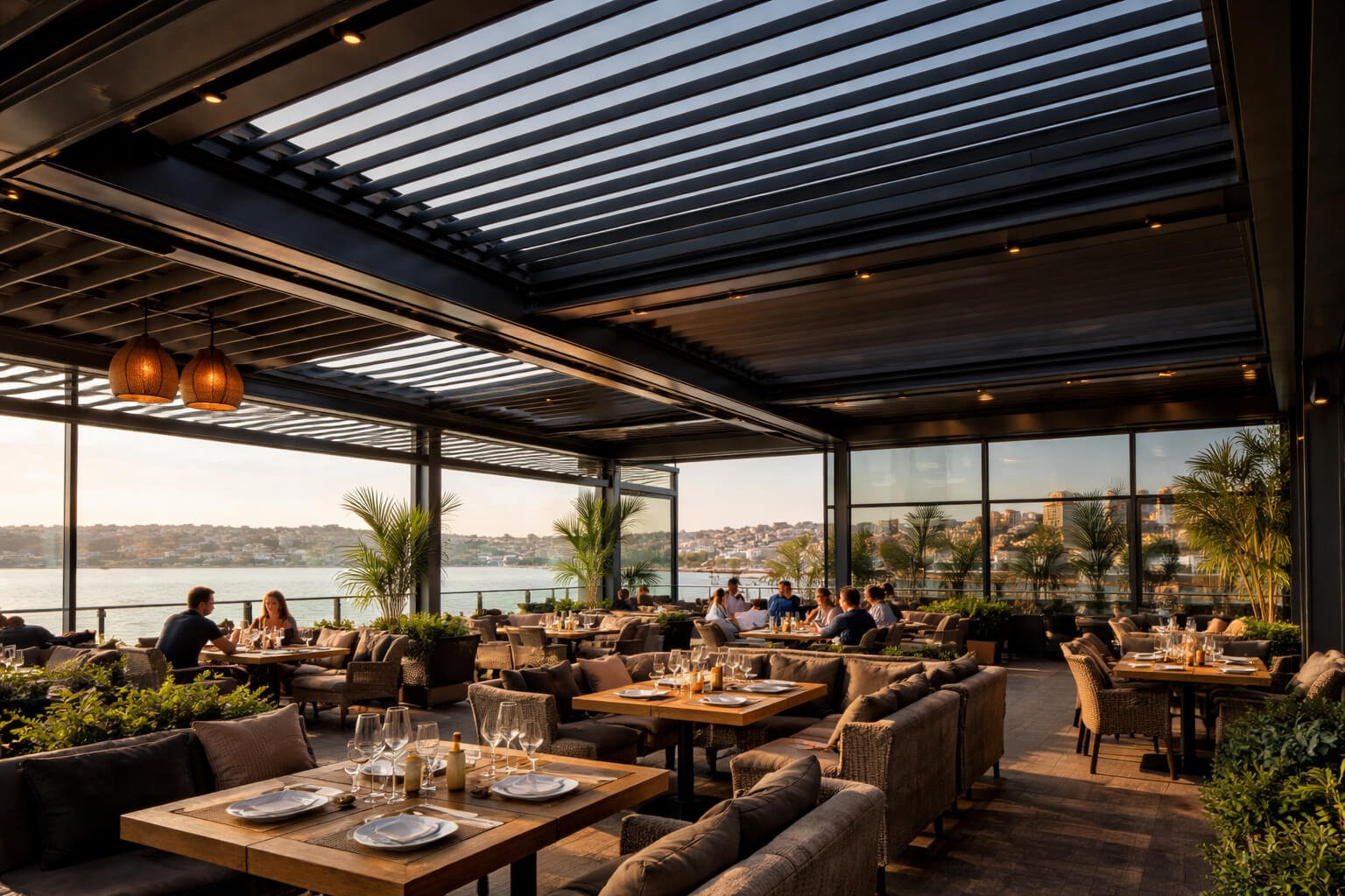 Rolling Roof sistemi, raylar üzerinde hareket eden paneller sayesinde açılıp kapanabilen modern bir tavan sistemidir. Dış mekanları dört mevsim kullanılabilir hale getirir.
